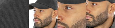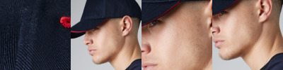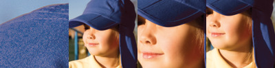 100% cotton. Three section fold up peak. No centre seam. Two eyelets each side. Elasticated back.