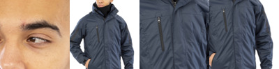 100% polyester ripstop outer. Outer jacket is waterproof 3000mm with taped seams, breathable 3000g and windproof. Detachable, adjustable lined hood with reflective peak. Full length two way zip. Tear release outer double storm flap with studs. Right chest pocket. Two front pockets. Elasticated cuffs with tear release adjuster. Adjustable drawcord hem. Removable two layer black soft shell jacket. Inner jacket has a full length zip. Inner and front side pockets. Plain cuffs. Cut out label. Access for decoration on outer jacket.